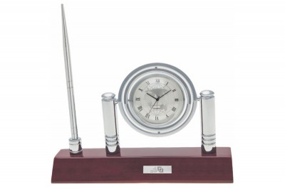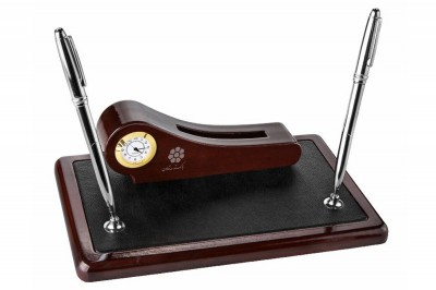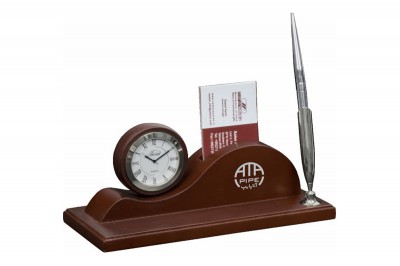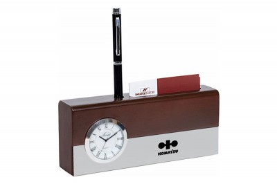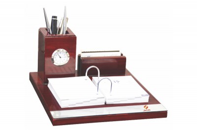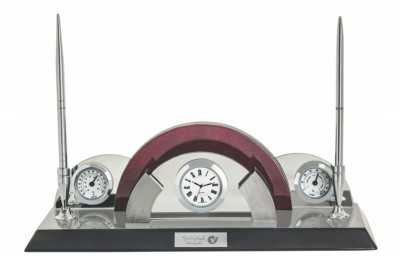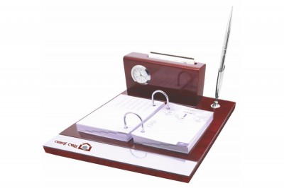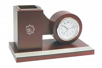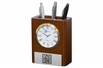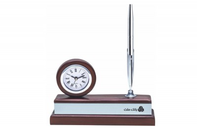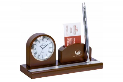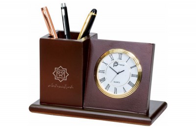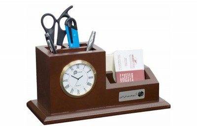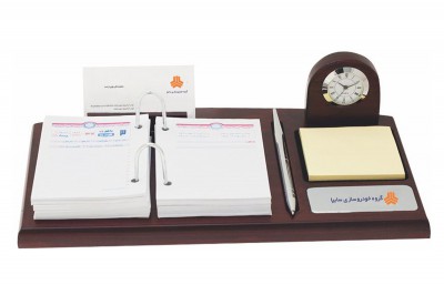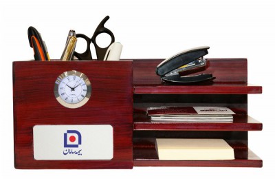 ساعت رومیزی شامل جاخودکار،جاکارتی ،جای تقویم، جای یادداشت و جای ملزومات کوچک اداری می باشد