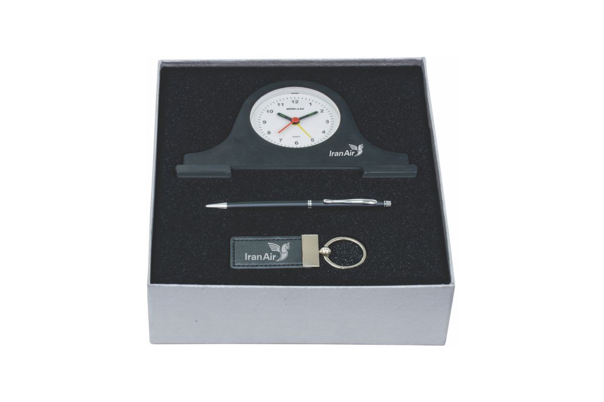 این ست شامل یک عدد ساعت رومیزی پلاستیکی، یک عدد جاسوئیچی و خودکار داخل جعبه مقوائی نفیس و زیبا میباشد